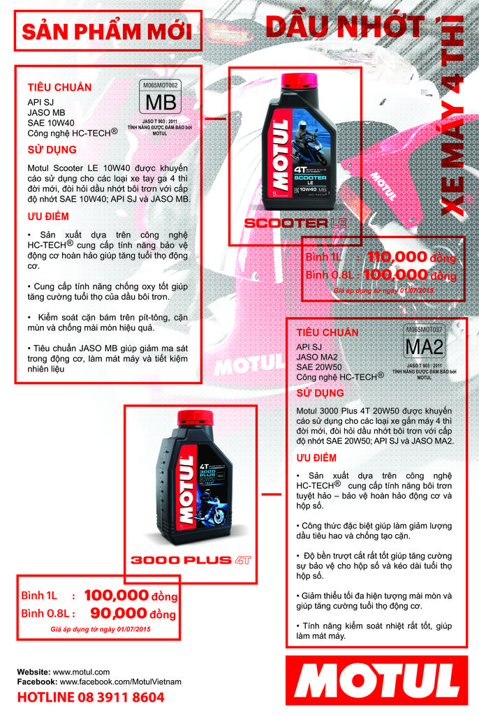 Motul 3000 Plus 4T 20w50 được biết đến là sản phẩm nhớt chính hãng chất lượng của tập đoàn dầu nhớt Motul và đánh dấu sự vươn tầm vượt trội của hãng đối với thị trường nhớt xe máy. Motul được tập đoàn nhớt Motul thiết kế đặc biệt cho các loại xe mô tô phân khối lớn, xe đua và xe thể thao, dựa trên sự hợp tác và nghiên cứu kĩ thuật cùng với các đội đua xe mô tô danh tiếng hàng đầu trên thế giới